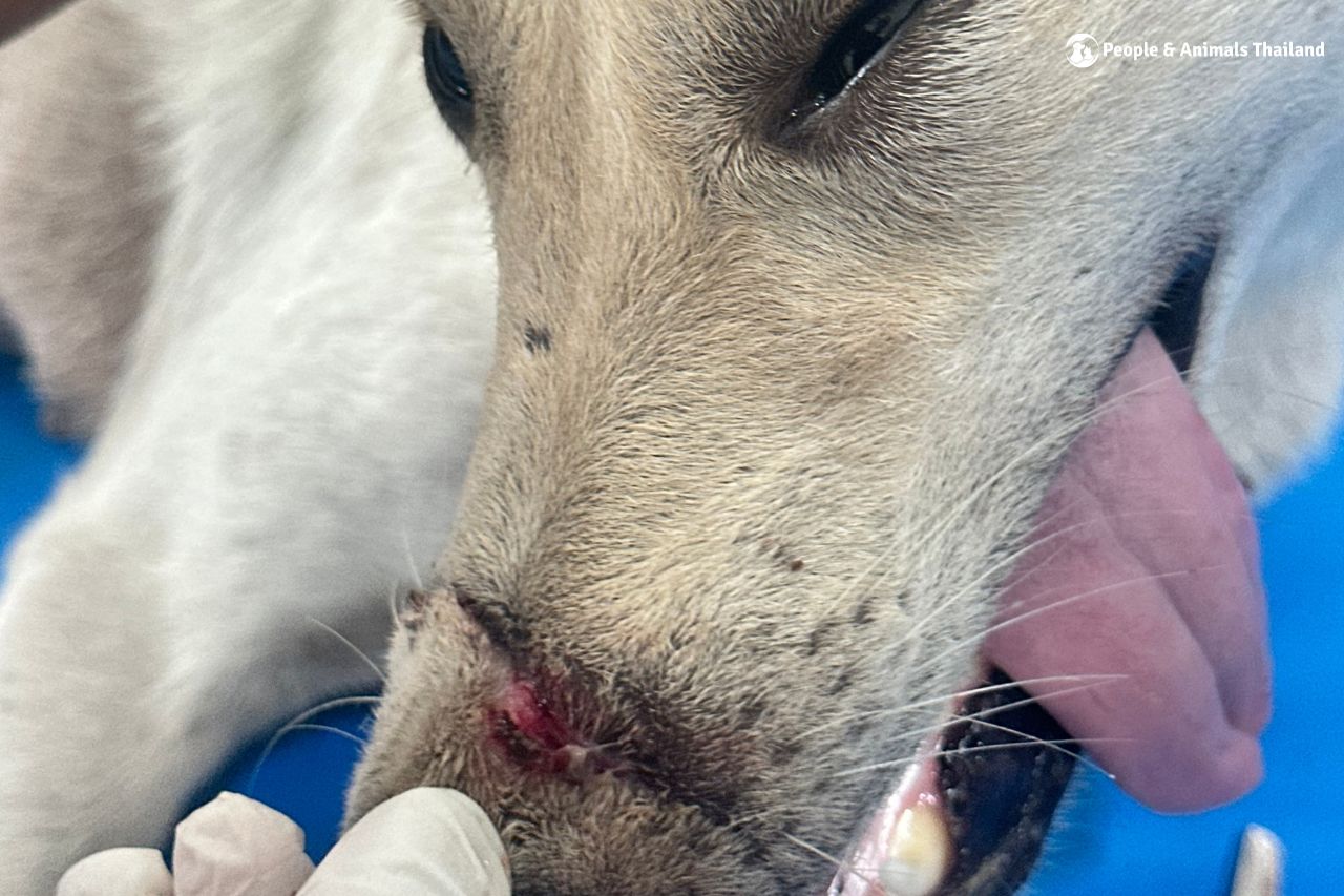 เคสนี้สร้างความสะเทือนใจให้กับพวกเราทุกคน แม่สุนัขที่อ่อนโยนตัวหนึ่งถูกพบในสภาพที่มีเชือกไนลอนรัดปากแน่นจนเกิดบาดแผลลึกและสร้างความเจ็บปวดไม่น้อย เธอเพิ่งคลอดลูกไม่นาน และเราคงจินตนาการได้เพียงเล็กน้อยถึงความหวาดกลัวและความทรมานที่เธอต้องเผชิญขณะพยายามดูแลลูก ๆ ของเธอ