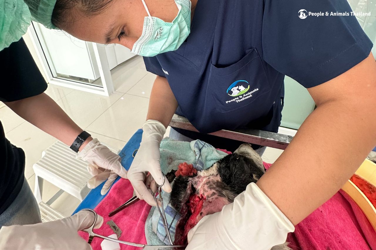ทีมของเราได้เข้าช่วยเหลือทันที ทำความสะอาดแผลทุกวัน ให้ยาปฏิชีวนะและยาแก้ปวด ตอนนี้ยังคงอยู่ในการดูแลของเรา และแข็งแรงขึ้นเรื่อย ๆ ในแต่ละวัน